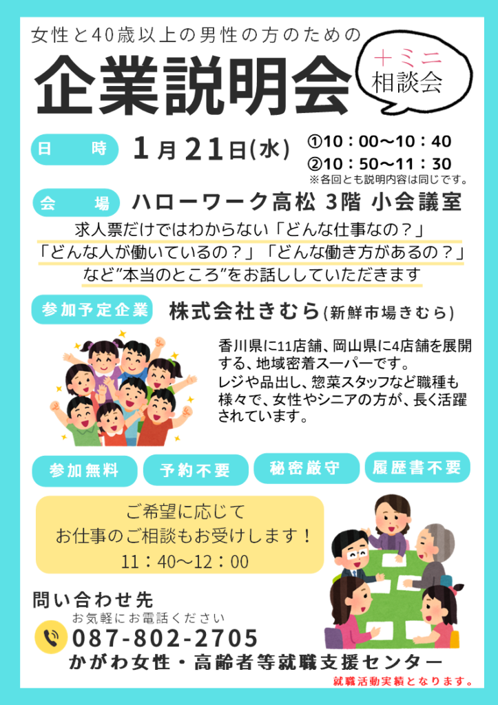 「企業説明会+ミニ相談会inハローワーク高松」1月21日(水)10:00~12:00のご案内